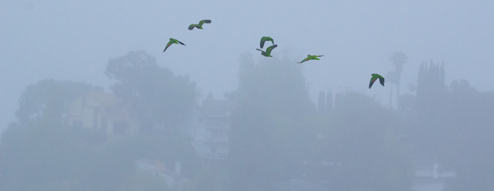 These birds, likely Lilac-crowned or Red-lored Amazons based on the location and group behavior, are resilient and resourceful. In the wild, Amazon Parrots feast on fruits, seeds, nuts, berries, and blossoms — and here in SoCal, they’ve discovered similar fare among backyard citrus trees and native plants. They’re loud, social, and impressively intelligent, often forming tight-knit bonds within their flocks.